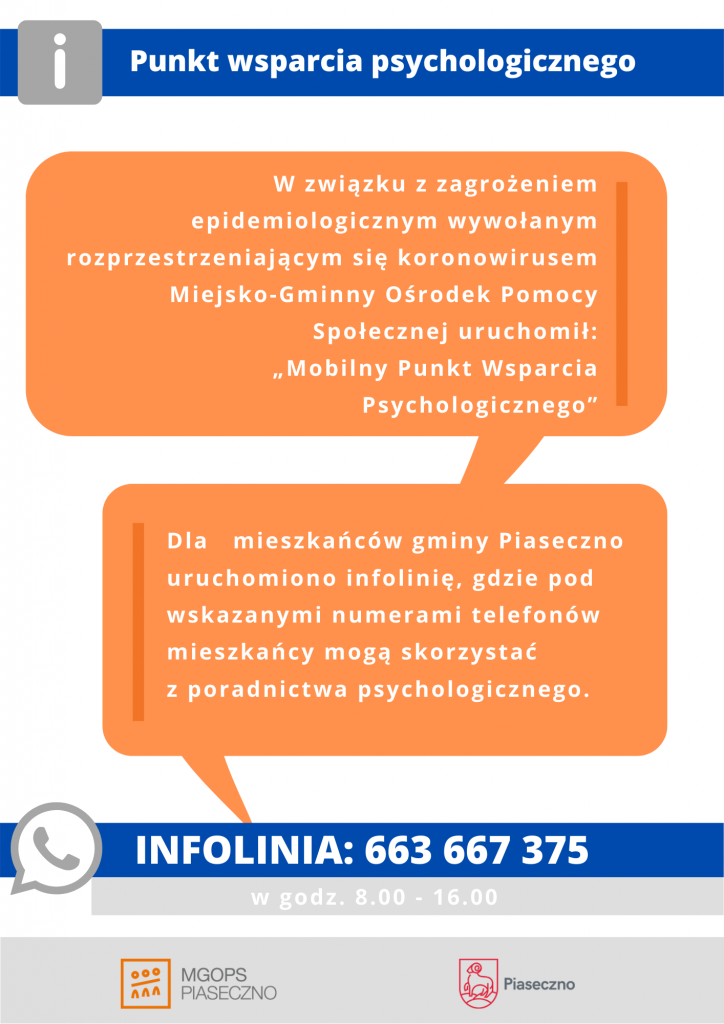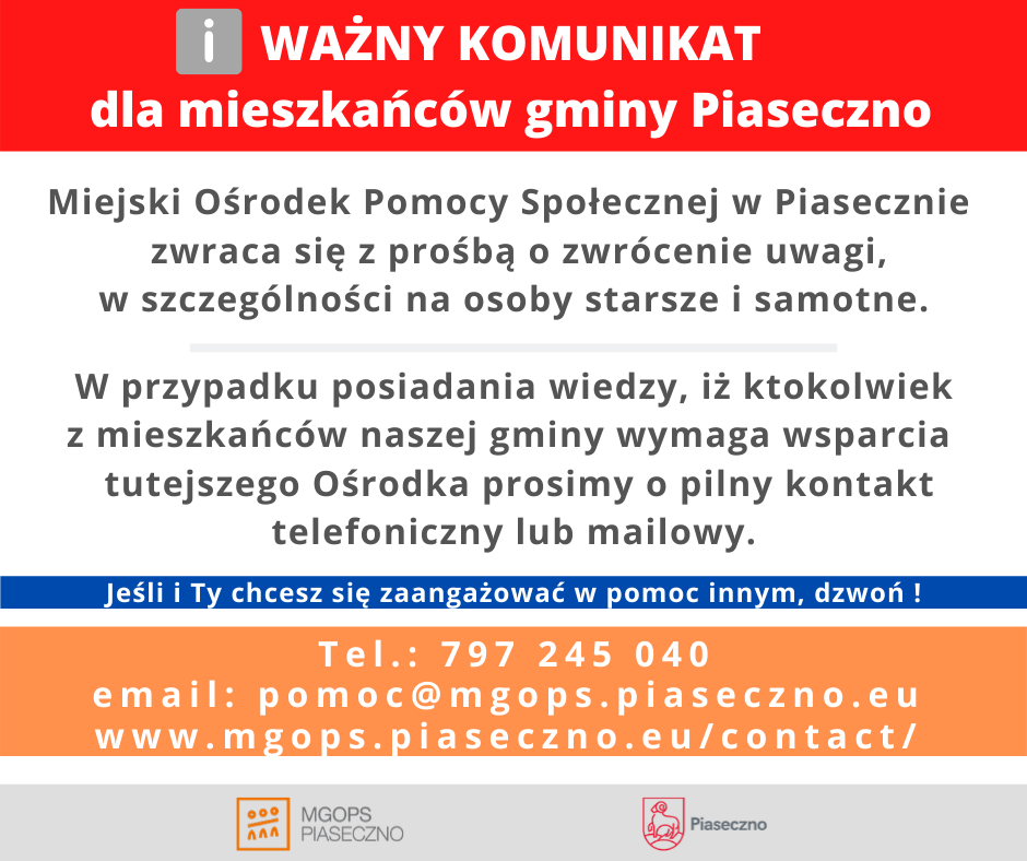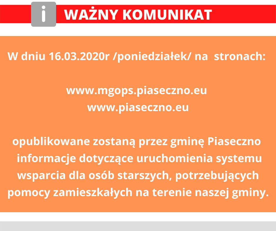 W dniu jutrzejszym na stronach: www.mgops.piaseczno.eu www.piaseczno.eu opublikowane zostaną przez gminę Piaseczno informacje dotyczące uruchomienia systemu wsparcia dla osób starszych, potrzebujących pomocy zamieszkałych na terenie naszej gminy.